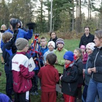 Postjakta ble avsluttet med tradisjonelt sjokoladeløp, lek og moro fra Grindasletta 13.oktober. Bål og pølser sørget “Skogen er vår” for. På bildet: hvem blir den heldige vinner av et par rulleski?